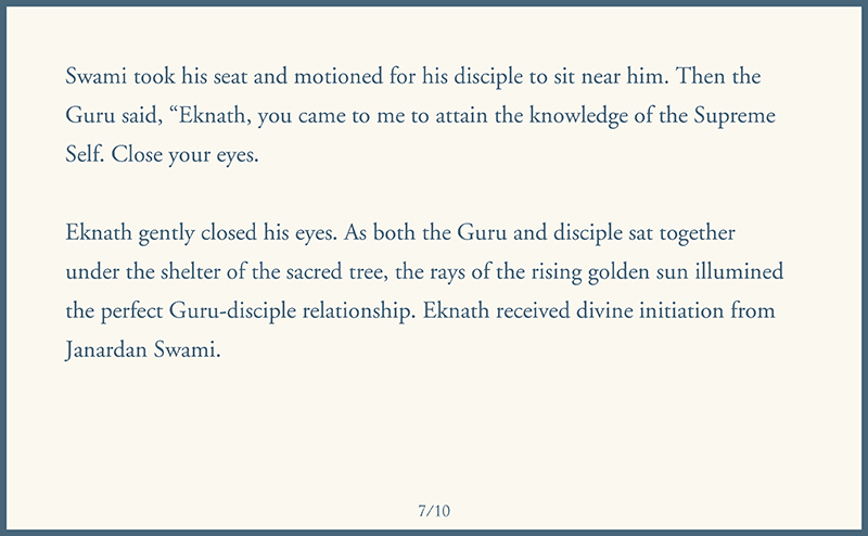 Eknath knew it was his dharma to find that coin. He lost himself in accomplishing it without worrying about how valuable this action was, or was not, to others. In the end, he felt completely happy for accomplishing his duty for his Guru. And not just that—he received an invaluable gift without asking for it.