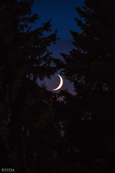 As I slowly twirled around several times, looking up into the evening sky, I could not locate the waxing moon. Feeling unsuccessful, I was about to go home. But then, I said to myself, “Just try one more time.” As I looked up, there was the radiant moon, shining its light down on me. My heart leapt with joy at the sight of it. Excitedly, I proceeded to take several pictures.
