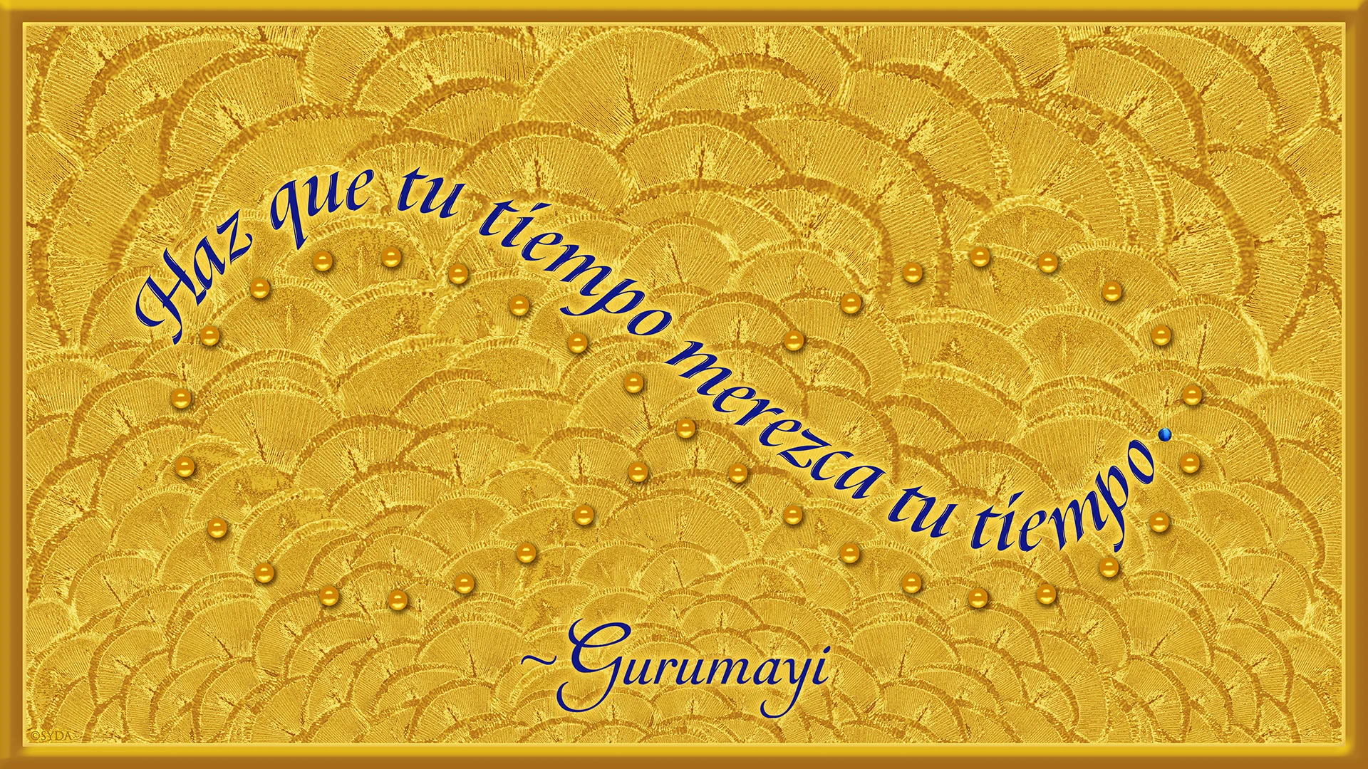 When I received Gurumayi’s Message Artwork, I recognized each part of my experience within it. There were the molten, gold drops and the words of Gurumayi’s Message forming infinity—reflecting the infinite nature of time and of her teachings. The words of Gurumayi’s Message are in blue, flowing like a river, guiding us in time, traveling with us in our sadhana. The single blue drop—the full stop at the end of Gurumayi’s Message—is like a drop of water, the Blue Pearl, stillness.