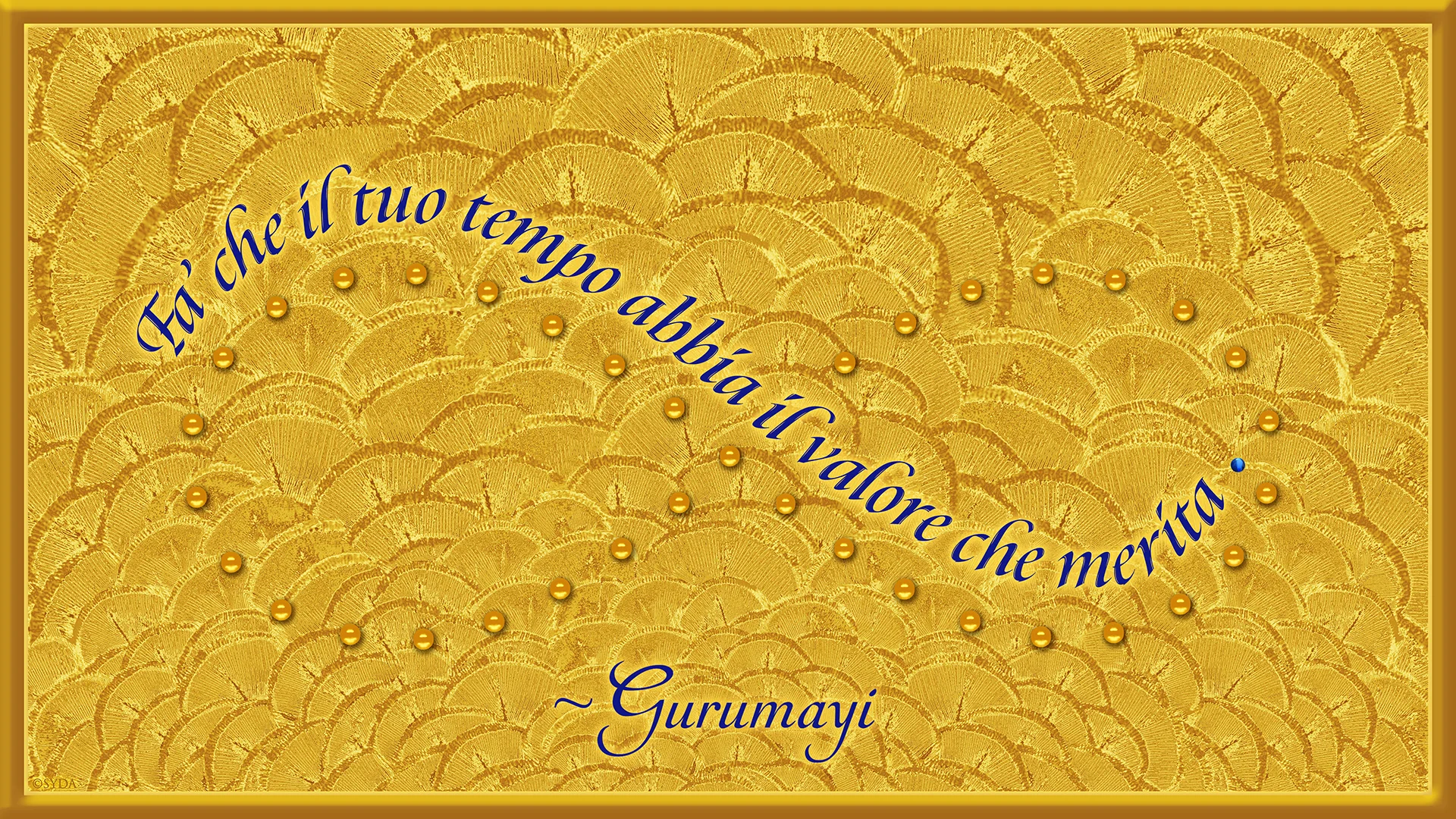 When I received Gurumayi’s Message Artwork, I recognized each part of my experience within it. There were the molten, gold drops and the words of Gurumayi’s Message forming infinity—reflecting the infinite nature of time and of her teachings. The words of Gurumayi’s Message are in blue, flowing like a river, guiding us in time, traveling with us in our sadhana. The single blue drop—the full stop at the end of Gurumayi’s Message—is like a drop of water, the Blue Pearl, stillness.