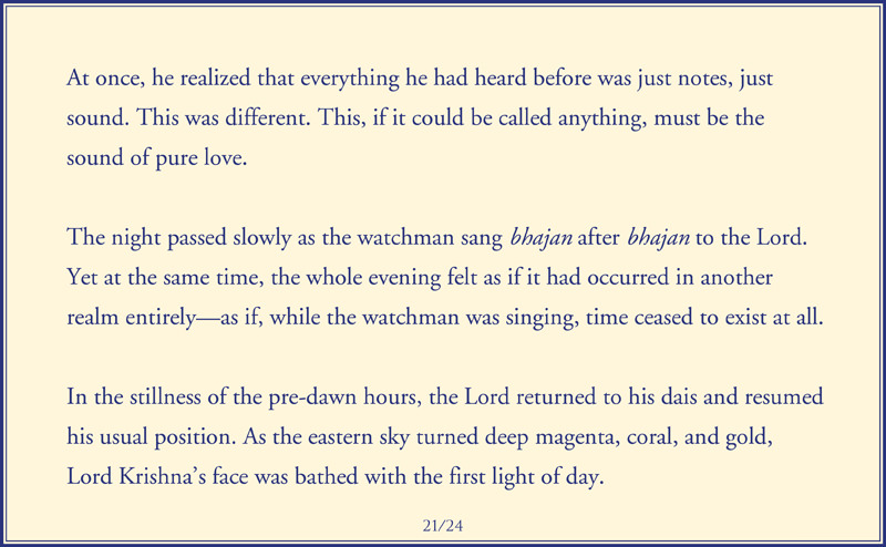 This engaging story of Lord Krishna and the Watchman opened my eyes and heart. As I’ve aged, I’ve lost my once lovely singing voice. Being a perfectionist like the priest, I seldom chant anymore, and I miss the sweetness. But now, after listening to this story, I realize that I want to make chanting a regular practice again. I can and will concentrate on the sound of love arising from my core as I chant, and I will bathe in its sweetness.